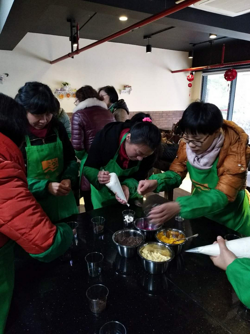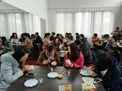 为庆祝三八妇女节,丰富女教职工的业余生活,缓解紧张繁忙的工作压力,我校于2018年3月2日下午组织全校三十多位女教职员工前往朱家角诗幽培训基地进行学做糕点、釉下彩活动。首先老师们在糕点师的指导下投入到了三色杯糕点制作中,将近1个小时制作,一杯杯色香味的杯子蛋糕出炉了;接着我们来到绘画教室,听着绘画师介绍釉下彩绘的绘制过程,老师们用各种颜料精心绘制了自己喜欢的图案;最后我们围坐在一起品茶聊天,女教师在紧张工作之余得到了身心的放松,使教师们以后能更加精力充沛地投入到繁重的工作中去。