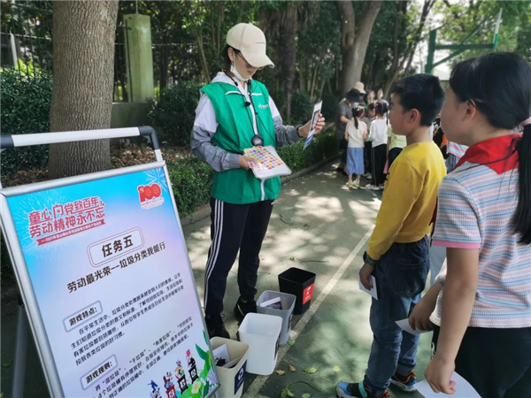 在PK项目之后,孩子们有序来到篮球场,进行劳动打卡游园活动。在这里设置的项目都是从“淀山湖小学家庭劳动清单”中挑选出来的,有“叠被子、剥毛豆、理书包、夹豆子、垃圾分类、认识农作物”,孩子们带着游园卡,在各个项目体验中积累五角星,收获劳动乐趣。