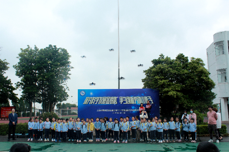 首先,小朋友们参与了学校首届科技节开幕式。一同参与了升旗仪式,聆听了校长国旗下讲话,观看了无人机方队表演。