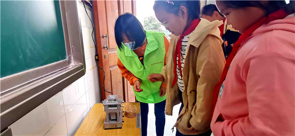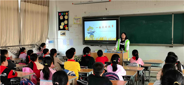 大队辅导员丁容说:“为了让孩子们了解稻谷的生产过程以及农民劳动的艰辛,我们让孩子们从灯光下走到阳光下,来到了田间地头,让他们去收割稻谷,懂得农民伯伯的劳动的艰辛和为什么要珍惜粮食。”
