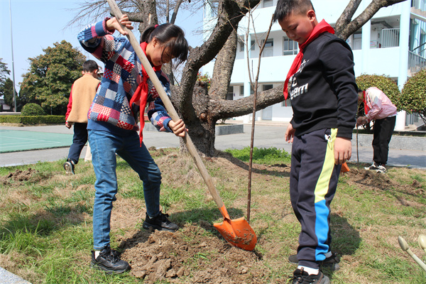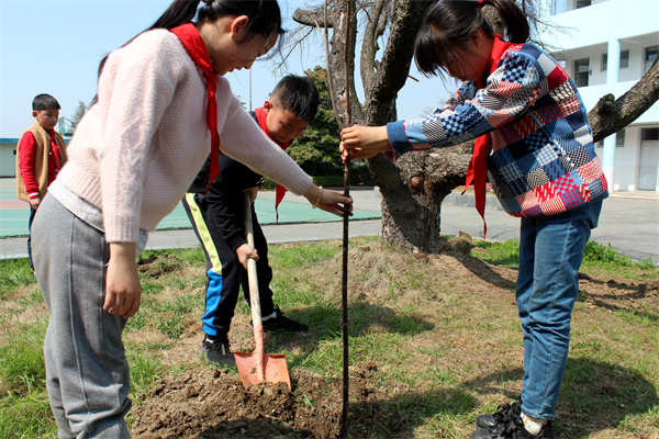 每年这个时候,学校大队部都会组织队员植树。今年,他们又在校园的一角种下了四棵李树。