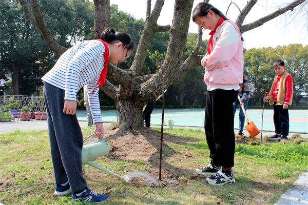 队员们在老师的帮助下挥锹、扶苗、培土、踩实、浇灌,师生们在团队合作中体会着亲自栽种的乐趣,也意识到,一棵树木从种植到枝繁叶茂的不易。