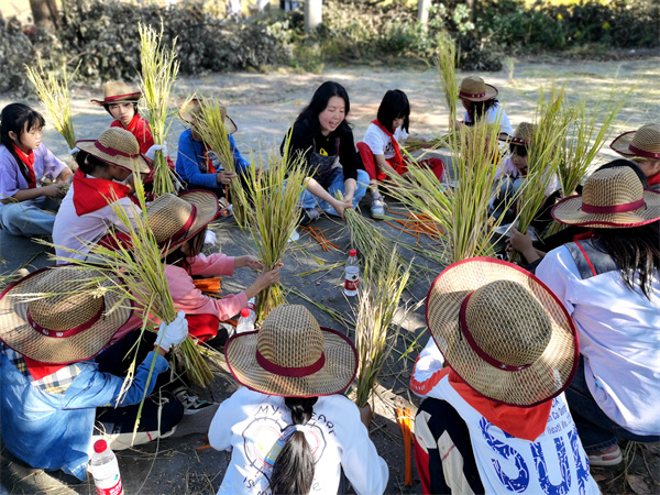 稻草文化在中国有着上千年的文化积淀,作为是田间的守望者,也是中国农耕文化的特殊符号。队员们拿着自己脱完谷粒的稻草开启了一场趣味玩稻草之旅。大家盘坐在在辅导员周围,开始用稻草分股,穿插,用扭绳固定并装饰点缀,经过精心创作,一个个趣味多样的稻草人就制作成功啦!