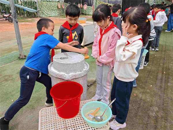 10月22日下午,三年级的学生们走近君宴现代农业园,开启了一场趣味“探豆”——认识与体验制作豆腐的实践活动。小小莲娃们在实践基地老师们的带领下,观看关于石磨豆浆制作过程的短片,认识了制作豆腐所需的各种劳动工具。